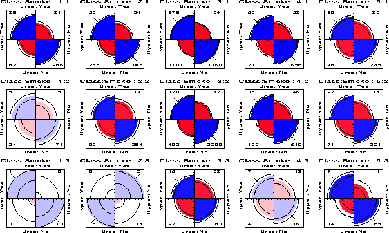 Figure 3.XX shows the fourfold displays for the 15 combinations of mother's social class and smoking, with non-smokers in the top row, and heaviest smokers in the bottom row. We see that, with one exception (a cell with small total frequency), the association between presence of hypertension and urea is positive, and roughly of the same magnitude over the categories of class, particularly for non- and moderate-smokers. In Example 7.15 we plot the log odds ratio directly (Figure 7.32), as well as the log odds for prevalence of these two symptoms.